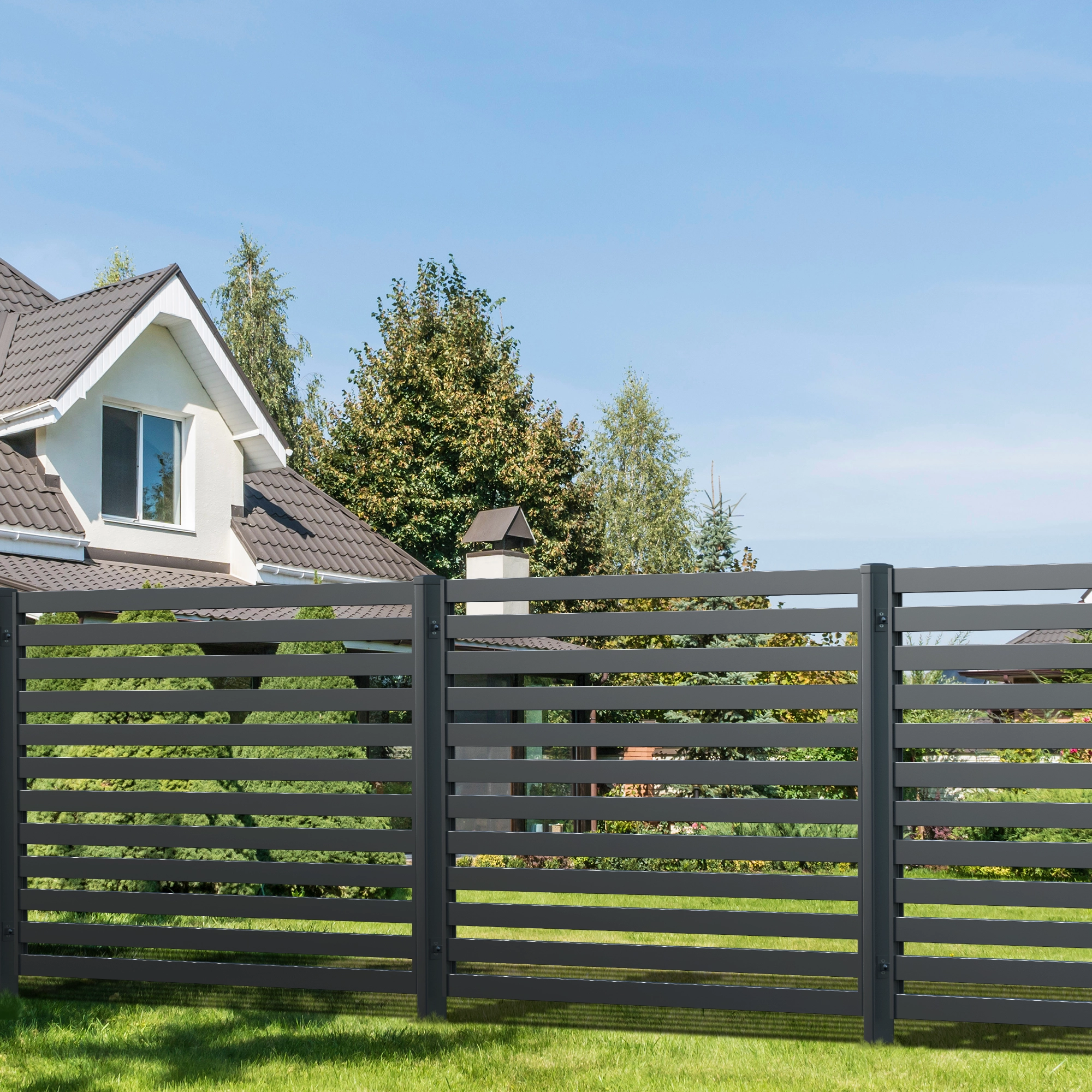 A Sapphire M kerítés kiváló választás a modern házak tulajdonosainak, akik keresnek divatos és egyben az ingatlanhoz illő kerítés. Ez az egyszerű és esztétikus mintázat a keresztirányú, széles síneknek köszönhetően biztonsági karaktert kölcsönöz az ingatlannak.