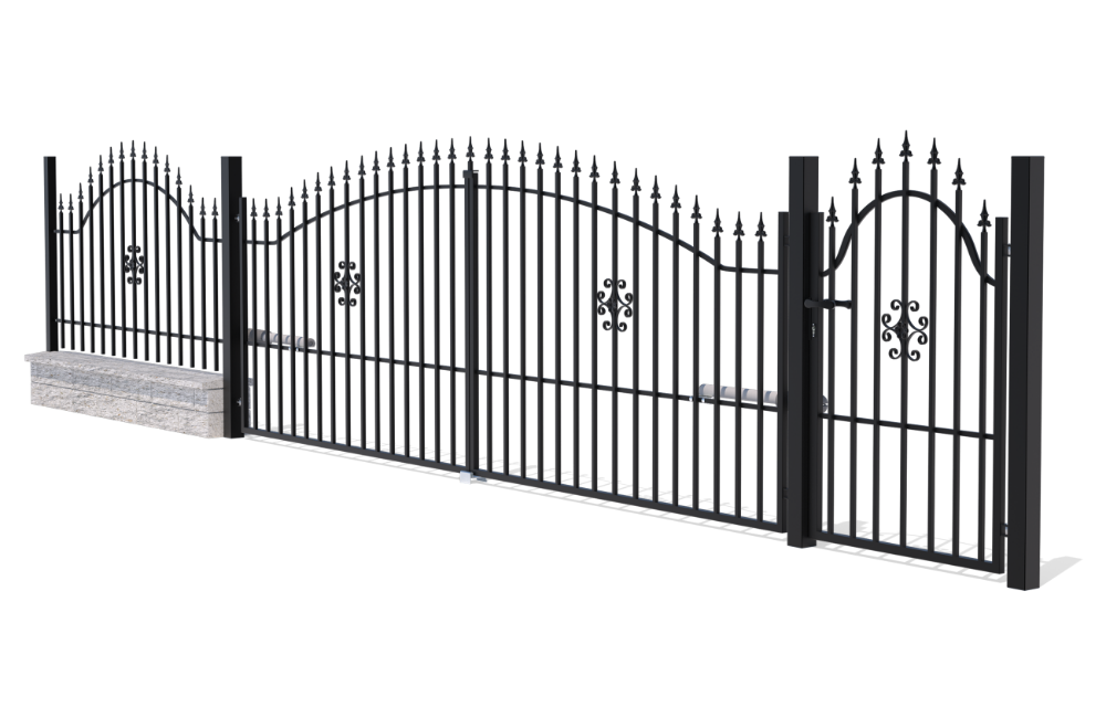 kétszárnyú kapu: két méretben: 400 cm, 350 cm széles és 150 cm magas és 180 cm